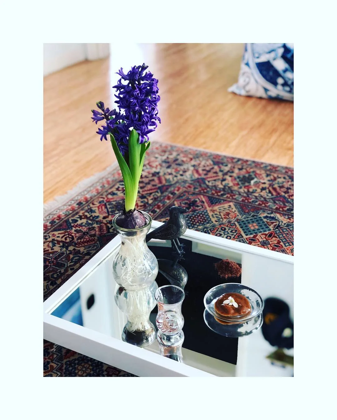 Other objects that don't start with sīn often make appearances, including candles, a fish (usually a live goldfish, here replaced with wooden one in Danish modernist form), a cultural book, here a copy of the Shāhnāmeh). Sombol (hyacinth) does start with sīn and is on the far left of the table.